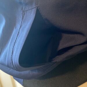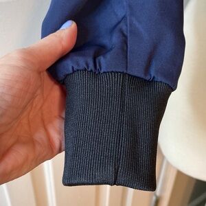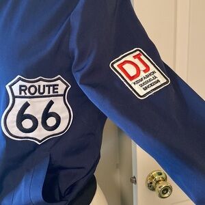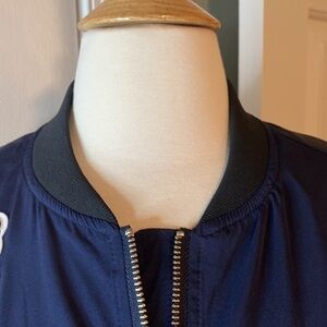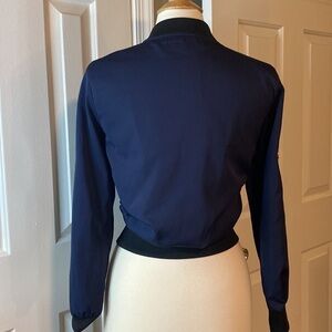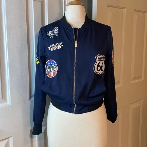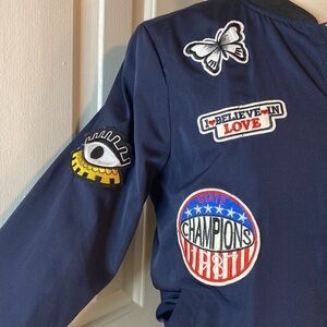 Super cute and fun. Great for back to school and cooler fall days. Patches on the front and arms. Cuffs and neckline are black, rest of jacket is navy blue. Ready to wear!