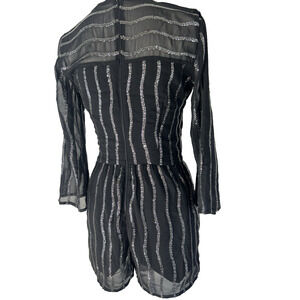The Abercrombie & Fitch Black & Silver Sequin Romper in size 00 is a stylish and glamorous one-piece outfit perfect for various occasions. The romper features a black and silver striped pattern with 3/4 sleeves and is made of polyester material. It includes zipper and sequin accents, adding a touch of sparkle to the overall look. The romper exudes a modern and edgy vibe, ideal for parties, cocktails, or casual outings, making it a versatile and eye-catching addition to any woman's wardrobe.