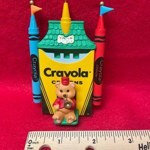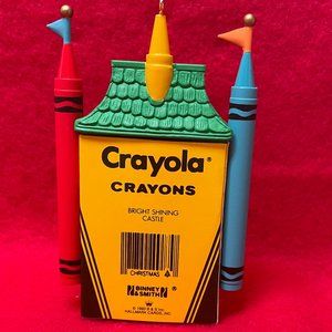 Castle Crayola Crayon 'Bright Shining Castle' Hallmark Collector's Series Ornament. 5th in the Crayola Crayon Series. Handcrafted and dated 1993. A colorful castle is made out of a crayon box and crayons. A red dressed bear holds a horn in his mouth to announce your arrival. Measures approx. 3.75" tall x 2.5" long x 1/4" wide. This ornament comes in it's original box and packaging material. Has never been displayed so is dust free and in MINT condition. Bundle this with other Crayola ornaments for a 20% discount.