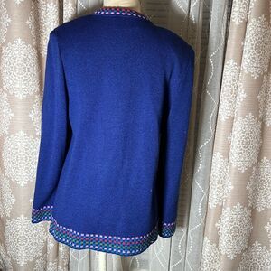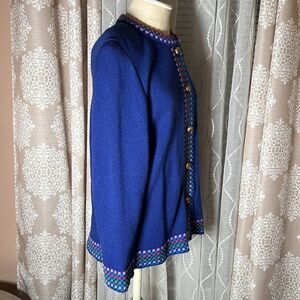The cardigan is a rich royal blue with adorable pink, green, and blue trim details around the collar, front, cuffs, and hem.