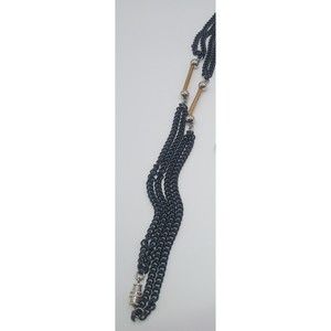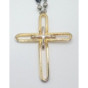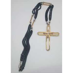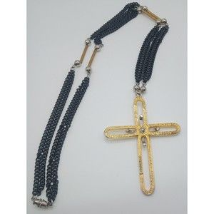 Vintage Castlecliff gold tone and silver tone cross pendant necklace. Large gold tone cross with a small silver tone cross inside. Double black chain with silver tone round beads and gold tone cylinder beads. Barrel screw clasp.