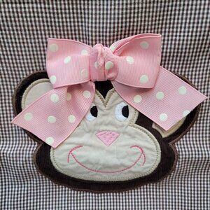The brown gingham base is sweetened by a pink polka dot bow and a joyful monkey applique, making it perfect for young adventurers and dreamers.