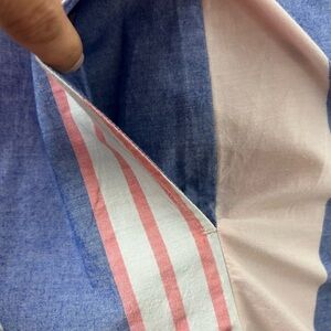 Adorable pullover dress with pockets. Chambray blue with pink stripes and a shimmer stripe down the center. Pockets. Pullover