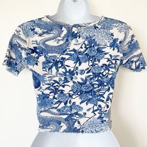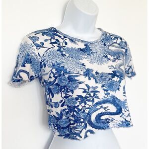 Keywords: Castro blue dragon top, Y2K tattoo print crop top, short sleeve fitted tee, dragon graphic shirt, vintage inspired Castro shirt, women’s small, blue white top