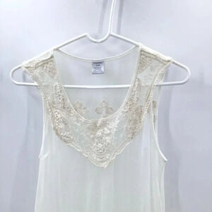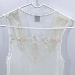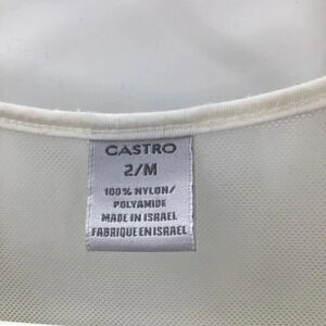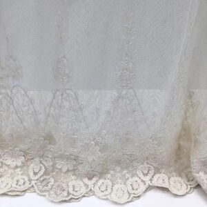 Stunning christening gown for infants in size 2/M, made by Castro of Israel. There is a ribbon drawstring at the feet. The body of the garment is mesh, with very ornate lace trim on bodice, skirting, and hem, all in the same tone-on-tone ecru shade. To be worn over a simple shift or outfit. A beautiful and memorable garment for a special day, would also be wonderful for holiday or baby photoshoots.