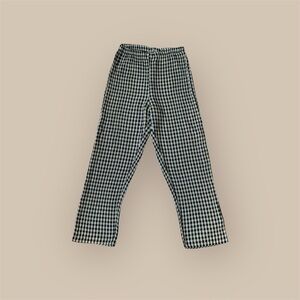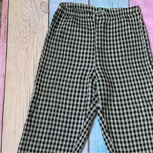 These casual pants feature a classic black and cream gingham pattern, offering a relaxed fit perfect for everyday wear. The timeless design makes them a versatile addition to any wardrobe, ideal for both casual outings and laid-back settings. No size tag would fit around a small/medium. In good vintage pre owned condition. Fabric is thin and lightweight. No holes. Missing string around the waist. Stretchy waistband. Super cute pair of pants!