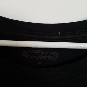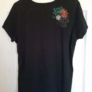 Long black tee to wear with legging or pants.Black with two flower designs on front and 1 flower deign on back shoulder. In very good condition.