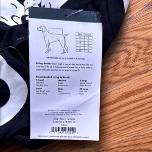 Black costume with white skeleton print. Glows in the dark. Ideal for spooky occasions.