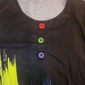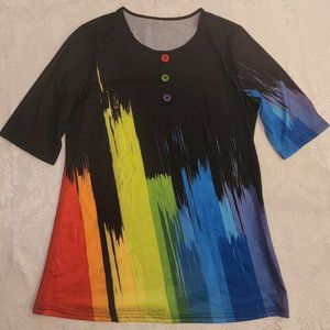 How fun is this shirt? Looks like someone took a paintbrush and went wild. Has about every color you can imagine: Red, orange, yellow, green, blue and lavender, all on a black background, so you'll be able to wear it with everything!  Three colorful buttons on the front and has one half sleeve length. Great with jeans, leggings, or shorts. Cotton/polyester blend. Easy wash and wear.
