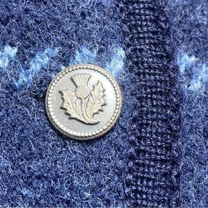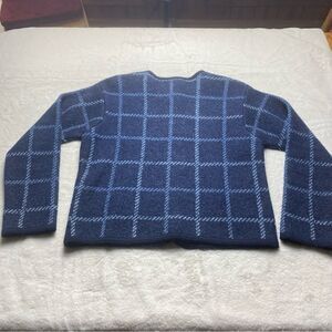Casual Corner Annex 100% Wool Blue Tone Cardigan/Jacket Size Large. Excellent used condition. Front decorative metal buttons. Knit trim. Large checked design. Measures chest 42", length 24.5", sleeve 23".