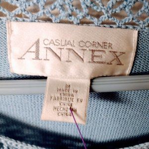Casual Corner Annex Button Up Lt Blue Sweater Crochet Flowers w/ Pearls Sz M