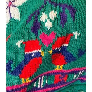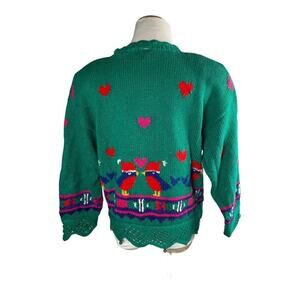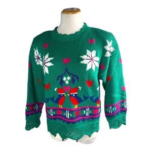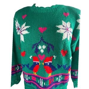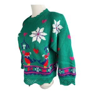Casual Corner Christmas Day Hand Knit Cropped Sweater Medium Green Bird Holiday