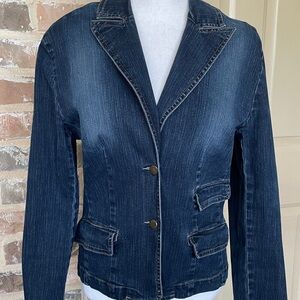 Casual Corner Denim Blazer Jean Jacket Dark Blue Stretch Notch Lapel Size 8