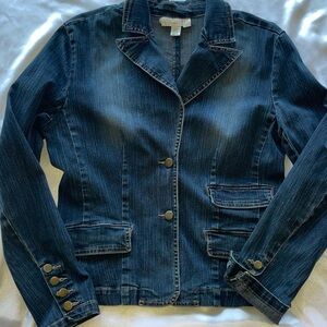 Perfect for a denim on denim look. Casual Corner Denim Blazer Jean Jacket Dark Blue Stretch Notch Lapel Size 8. Button up front and cuffs. Slim fit. Excellent condition. Approximate measurements in photos.