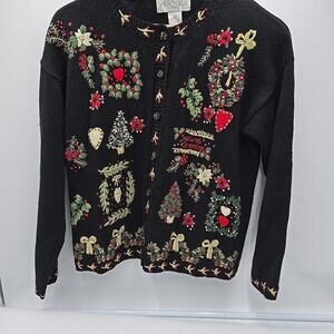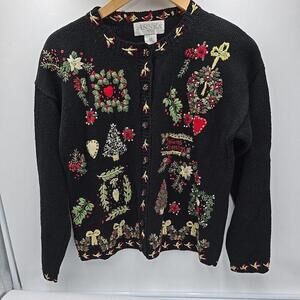 Casual Corner Ugly Christmas Embroidered Beaded Button Up Cardigan Sweater PS