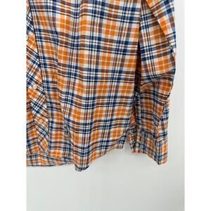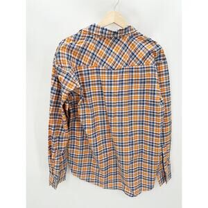 Orange and blue plaid pearl snap button up shirt. Button front closure, collared neckline, long sleeves.