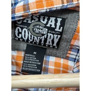 Casual Country Shirt Men MEDIUM Orange Blue Plaid Pearl Snap Button Up