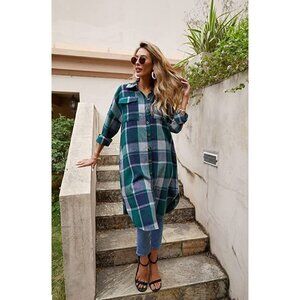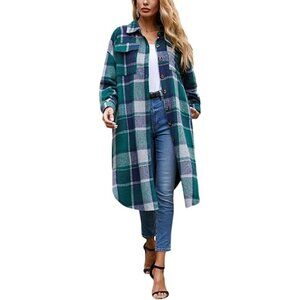 NWT Women's Casual Green Plaid Button Down Long Puff Sleeve Trench Coat Jacket Shacket Wool Blend