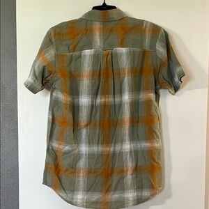 This casual button-down shirt showcases a lively plaid pattern in green and orange, ideal for a laid-back outing. Crafted from lightweight fabric, it offers comfort and breathability for warm days.