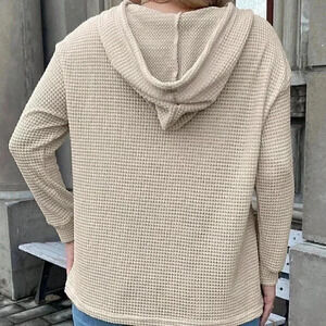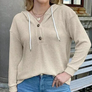 Casual Half Button Drop Shoulder Drawstring Hoodie Apricot