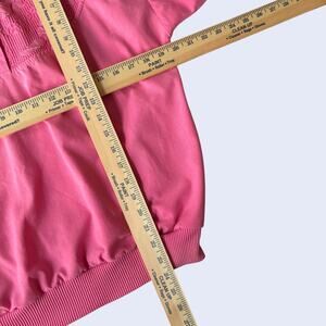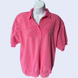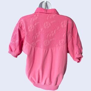 Preppy 80s knit polo in pink with floral-jacquard front panels, relaxed drop shoulder, short sleeves, and a banded waist. Soft poly-cotton knit; lightweight and comfy. Vintage 1980s/90s vibe. Solid with textured floral. Condition: Excellent.