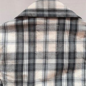 Grey plaid 100% cotton jacket. Lightweight and machine washable. This piece can be worn as a top, jacket blouse or jacket. Looks great when worn with jeans for any casual occasion.