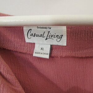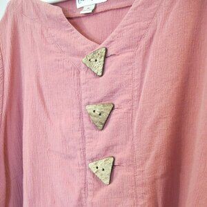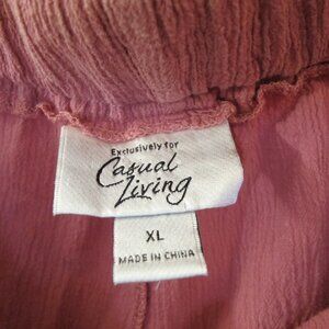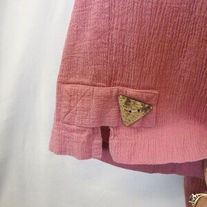 Casual Living matched set of short sleeved top with v-neck and triangular wood buttons and cropped pants with tab and matching button detail at bottom. Waist is flat front and elastic back.