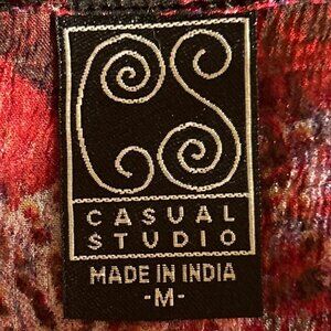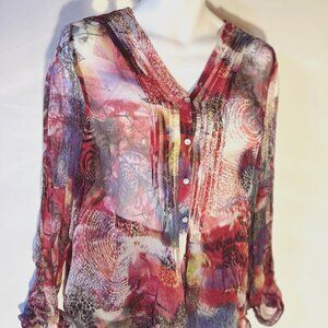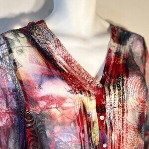 Casual Studio SZ M Navy /red abstract sheer button front blouse artsy graphic