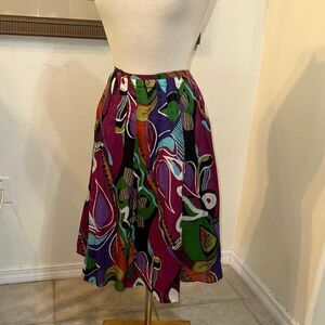 Vibrant and stylish, this skirt features a bold abstract design. Perfect for adding a pop of color to your wardrobe. This skirt is made very well in India…side zip and button, fully lined, and fabulous cotton material. Excellent condition!