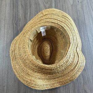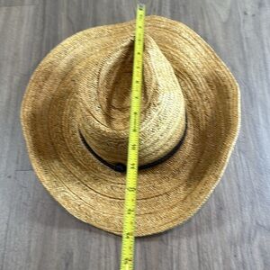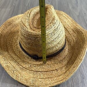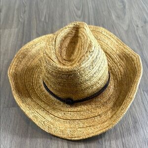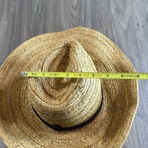 Casual tan straw hat featuring a sleek black band. Ideal for sunny outings.