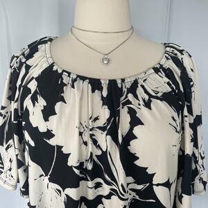 Casual Top Plus Size 2X Black Cream Floral Peplum Ruffle Boho Short Sleeve Flowy