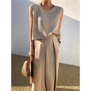 Casual Two Piece Sleeveless Crew Neck Pleated Pant Set Khaki 12