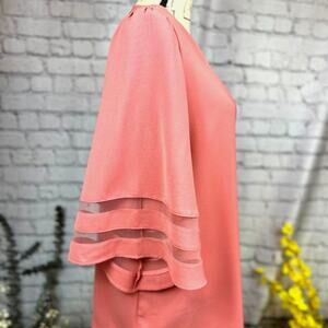 Casual V Neck 3/4 Bell Sleeve Mesh Panel Blouse Coral XL