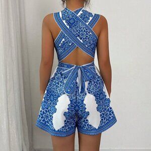 Casual Women's Allover Print Halter Crisscross Back Cinched Waist romper