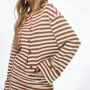 Casual Women's Brown Striped Button Front Knit Cardigan & Mini Skirt Set