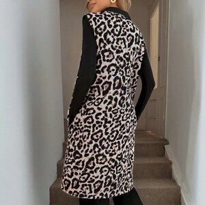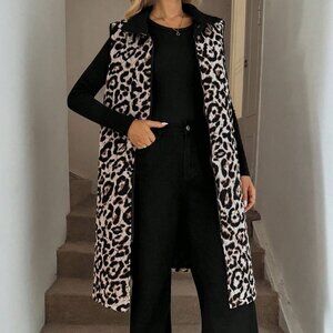 Casual Women's Leopard print Zip up Long Vest Jacket With Pockets