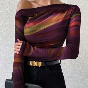 Casual Women's Marble Ombre Print Asymmetric Neck Fitted top