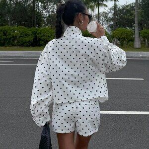 Casual Women's Polka Dot Print Long Sleeve Zip Front Jacket And Shorts set
