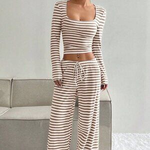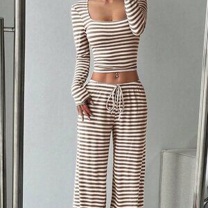 Casual Women's Striped Minimalist Long Sleeve Top & Tie Front pants set