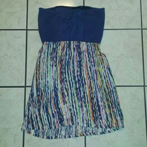 Navy blue dress with cute colorful stripes. Dress includes pockets. Also has sticky material inside the dress to hold it the top up better.