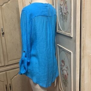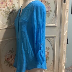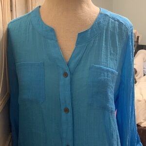Has button front crewneck long three-quarter inch sleeve that can be worn down or buttoned up breast pockets Hilow bottom, him sides, shorter than middle, can be unbuttoned and tied in a knot in the front very versatile, comfortable shirt, beautiful color, rayon, and polyester and wash