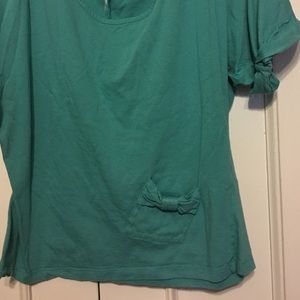 Casual turquoise blue top with bow pocket detail on the bottom front.