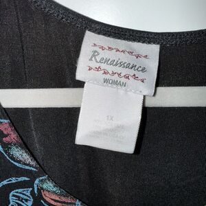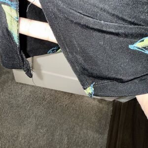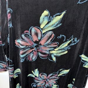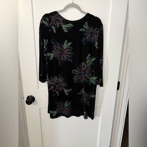 This casual dress showcases a black base adorned with a subtle green floral pattern, perfect for a relaxed yet stylish look. Featuring 3/4 length dolman sleeves and a scoop neckline, it offers a comfortable and flattering fit. The soft, stretchy fabric ensures ease of movement and a graceful drape.