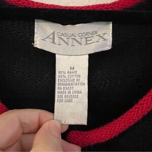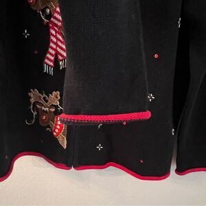 Casual Corner Annex Christmas Sweater. Size Medium. Black With Red Trim. Reindeer. Full Zip Front. Beading. Sequin. Long sleeves. 55% ramie 45% cotton. Length from shoulder to bottom is 25”. Armpit to armpit