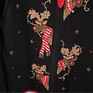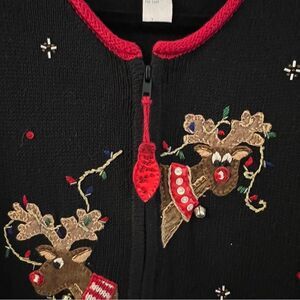 Casual Corner Christmas Sweater Size Medium Black Red Reindeer Zip Front
