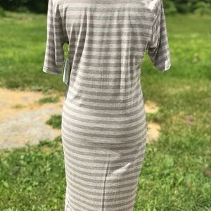 Cute casual large size LuLaRoe two toned gray stripe Julia style dress. This dress is very versatile and the material provides give, and is very soft. The dress is brand new with tags attached, never worn, or tied in. Comes from a smoke free home.