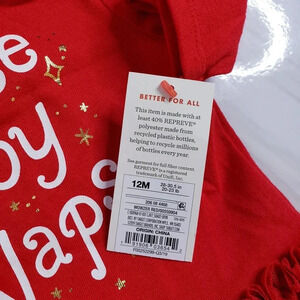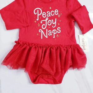New With Tag, Cat And Jack holiday outfit onesie with tutu detail attached on waist, long sleeve, color red, white and gold print, Peace Joy Naps logo, 12 months kids.