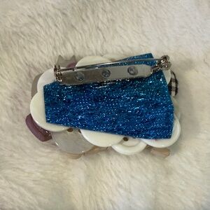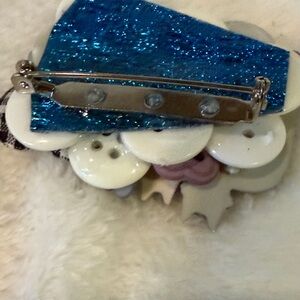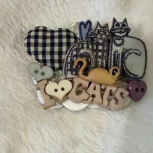 Adorable handmade pin cluster featuring stitched cat motifs and mixed buttons. Neutral pastel palette with cream, beige, soft gray and lavender accents. Playful ‘I ♥ CATS’ lettering and a small yellow cat detail. Great for jackets, bags, or craft projects.