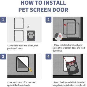 🧿Installation manual attached, best with 2 people to install and set it up. Easy to cut the screen and snap together, reinforced with screws/nuts avoid the doggie door fall down easily. The paw print screen filled opening is a cute addition.