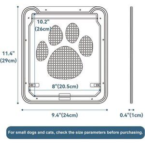 🧿Outside frame size: 9.4 x 11.4 inch, Inside flap opening size: 8 x 10 inch. Select and install this door by measuring the maximum width and height of the pets. Most less than 30 lb small dogs, cats or other small pets use it great, not for large dogs.